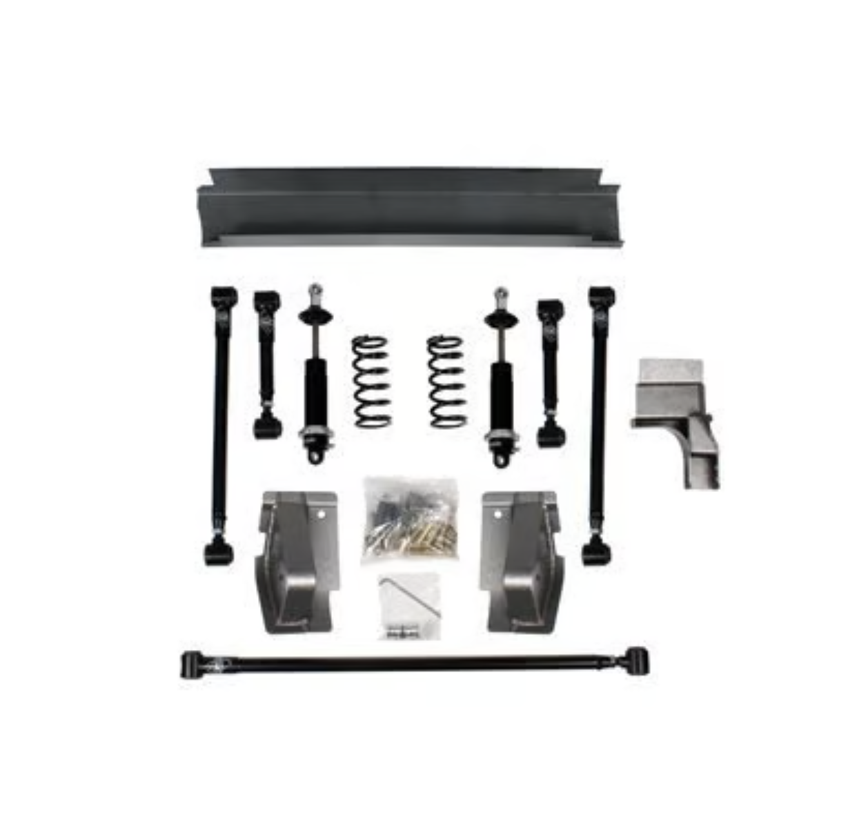 This is a great way to upgrade from original leaf spring suspension. Unlike our competitors, Detroit Speed’s exclusive new 4-link geometry design is uncompromised to achieve the best possible handling. The Detroit Speed “Swivel-Link™” (Patent No. 7,398,984) allows the suspension to fully articulate with smooth solid motion an no binding. The best feature is that this is achieved without heim-joints. Heim-joints are noisy and prone to short-term life. The Detroit Speed QUADRALink utilizes tuned high-durometer rubber bushings (in place of heim joints or squeaky urethane bushings). The long upper links provide great pinion and u-joint angle control. Contrary to competitors’ kits, our kit utilizes a panhard rod that provides precise and effective rear axle lateral location during hard cornering. The panhard rod is adjustable as ride height changes for roll center control. The rear upper shock crossmember strengthens the rear body and frame section. Don’t settle for anything less than our QUADRALink rear suspension!Spring Rate: 250lbs/inSpring Free Length: 8in