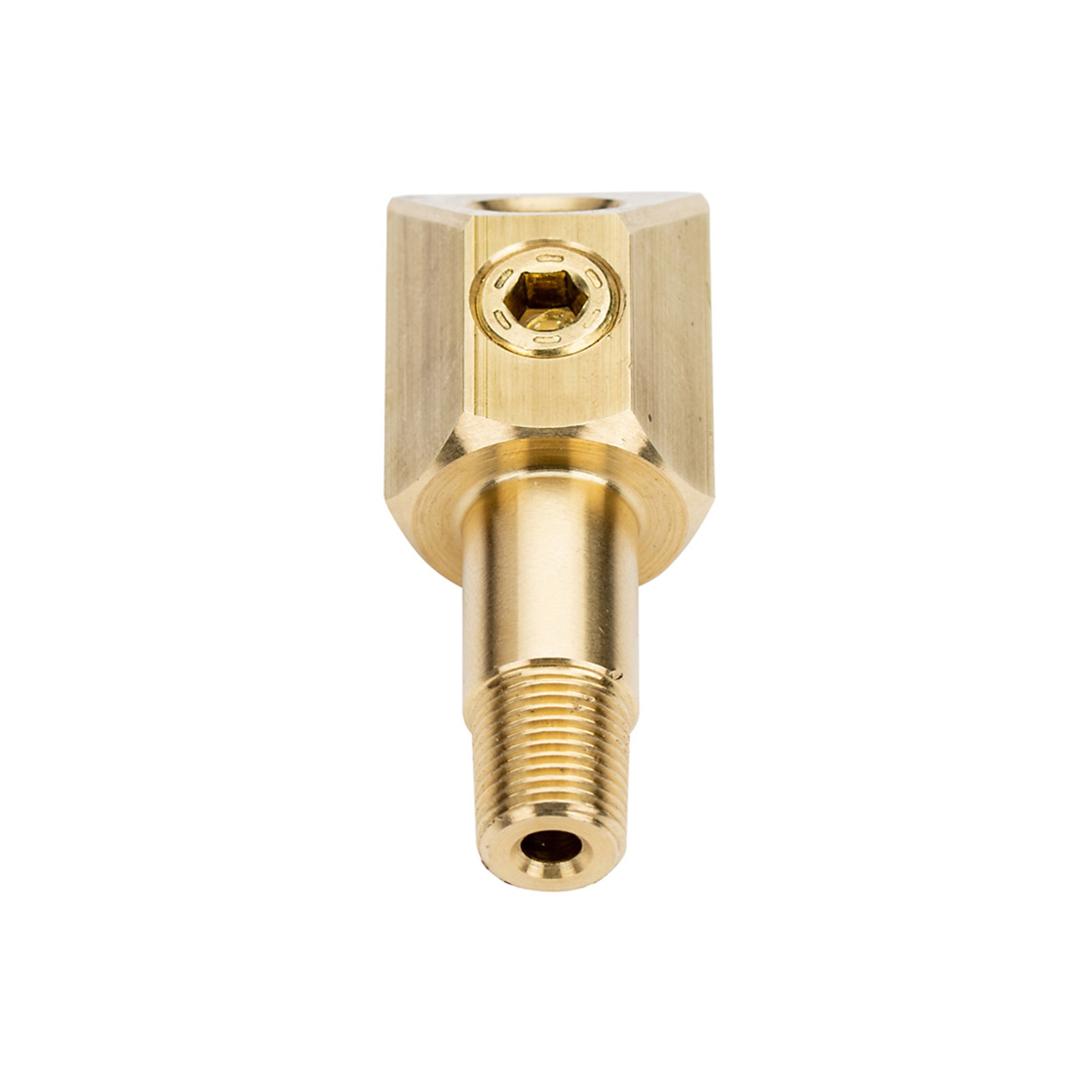 It’s no secret that the small block Chevy doesn’t allow much space for an oil pressure sensor. For years, enthusiasts hit the hardware store in search of a few brass fittings to move the sensor up and away from the intake and distributor. This one-piece machined adapter gives you the clearance and flexibility you need in one convenient solution. The 130070 is machined in the USA with a male 1/8” NPT thread to fit your block, plus two female 1/8” NPT threads to accept the sensor of your choice. The female ports are at 45 and 90 degrees, allowing maximum flexibility for a variety of situations. A 1/8” NPT pipe-plug is included to block off the unused port.